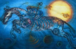 She took a deep breath. “Anyway…I can explain the buttons…I think. It is ‘funny, strange’ that the stars have turned into buttons because some people think the dark night sky is a bit like a cloth with pin-pricks through it. It is ‘funny, strange’ that the sun should turn into a sword like the sword of Damocles hanging over a guilty nation. It is ‘funny, strange’ that the moon should turn into a bottle when the country is drunk with dark thoughts and whispers.”